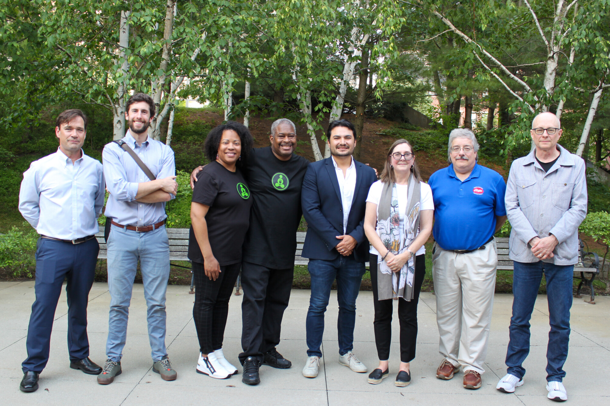 DeltaClimeVT Energy 2023 climate economy business accelerator announces ProsumerGrid as the winner of the $25,000 prize and a pilot project with Burlington Electric Department (BED). BED also awarded pilot projects to Plug Zen and Vermillion Power Technologies during the awards ceremony at Main Street Landing in Burlington, VT on June 15, 2023. Left to right: Geoff Robertson of DeltaClimeVT at Vermont Sustainable Jobs Fund, Freddy Hall of Burlington Electric Department, Chenel and Kwabena “Q” Johnson of Plug Zen, Marcelo Sandoval of ProsumerGrid, Kelly Hall of Vermillion Power Technologies, James Gibbons of Burlington Electric Department and Joseph Steig of ecosVC. Photo courtesy of Vermont Sustainable Jobs Fund.