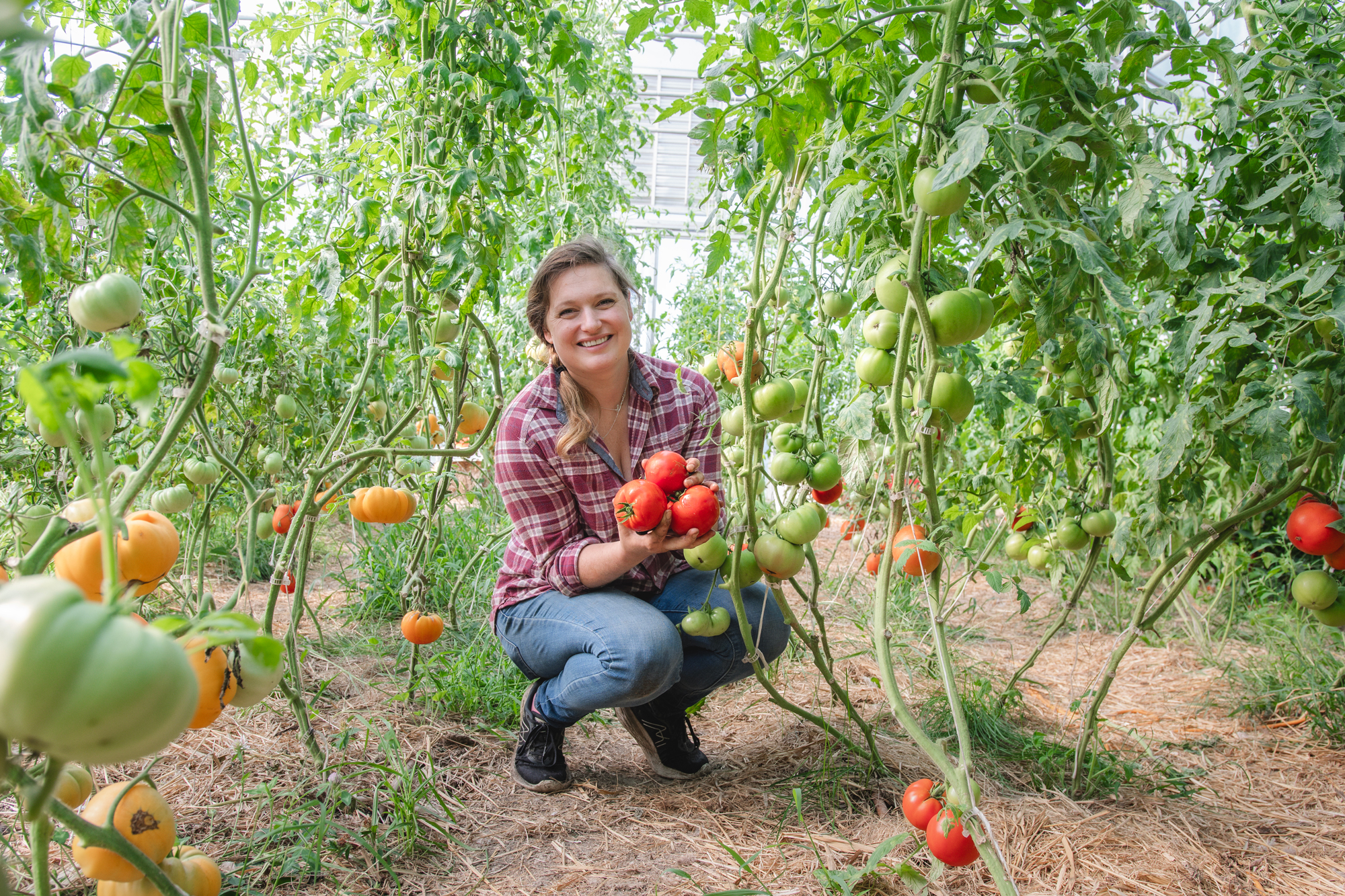 Jenny Vascotto inspects tomatoes in the couple’s greenhouse in Lyndonville. Photo by Erica Houskeeper.
